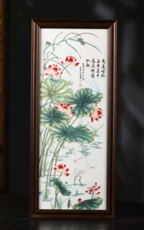 这幅“景德镇瓷板画(荷塘鹭鸟)”采用优质高岭土,胎质致密细腻、洁白如玉,釉面细腻温润、莹润如镜,釉上彩工笔绘制的“荷塘鹭鸟”花纹清新···