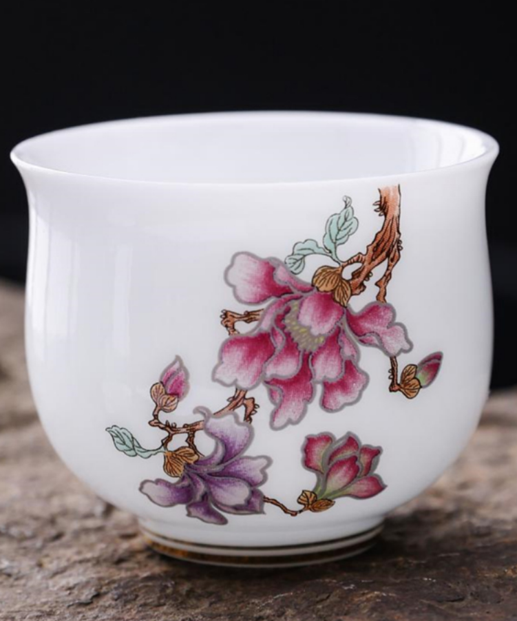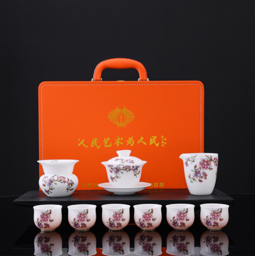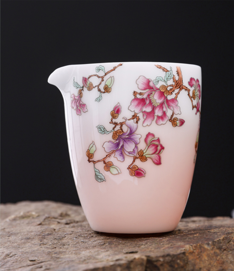 这款《朱华瓷韵》茶具,瓷上生花,茶里藏春。莹润白瓷作骨,粉蕊繁花为魂。朱华瓷韵茶具,似从宋词里走出的雅物:盖碗承香,弧面流转着月光的温柔;公道匀露,将茶汤晕染成琥珀流金;品杯纳意,杯沿轻抿间,藏着春日枝头的嫣然。瓷上花枝蜿蜒,如把江南春色凝缩于盏。注汤入杯,橙波荡漾,与釉下花影相映,恍若风拂花树、香落茶瓯。执此套茶具沏茶,是与古意相逢——指尖触过温润瓷面,茶汤漫润舌尖,尘世喧嚣尽褪,只剩一室幽芳,半盏清欢,将平凡日常晕染成诗。